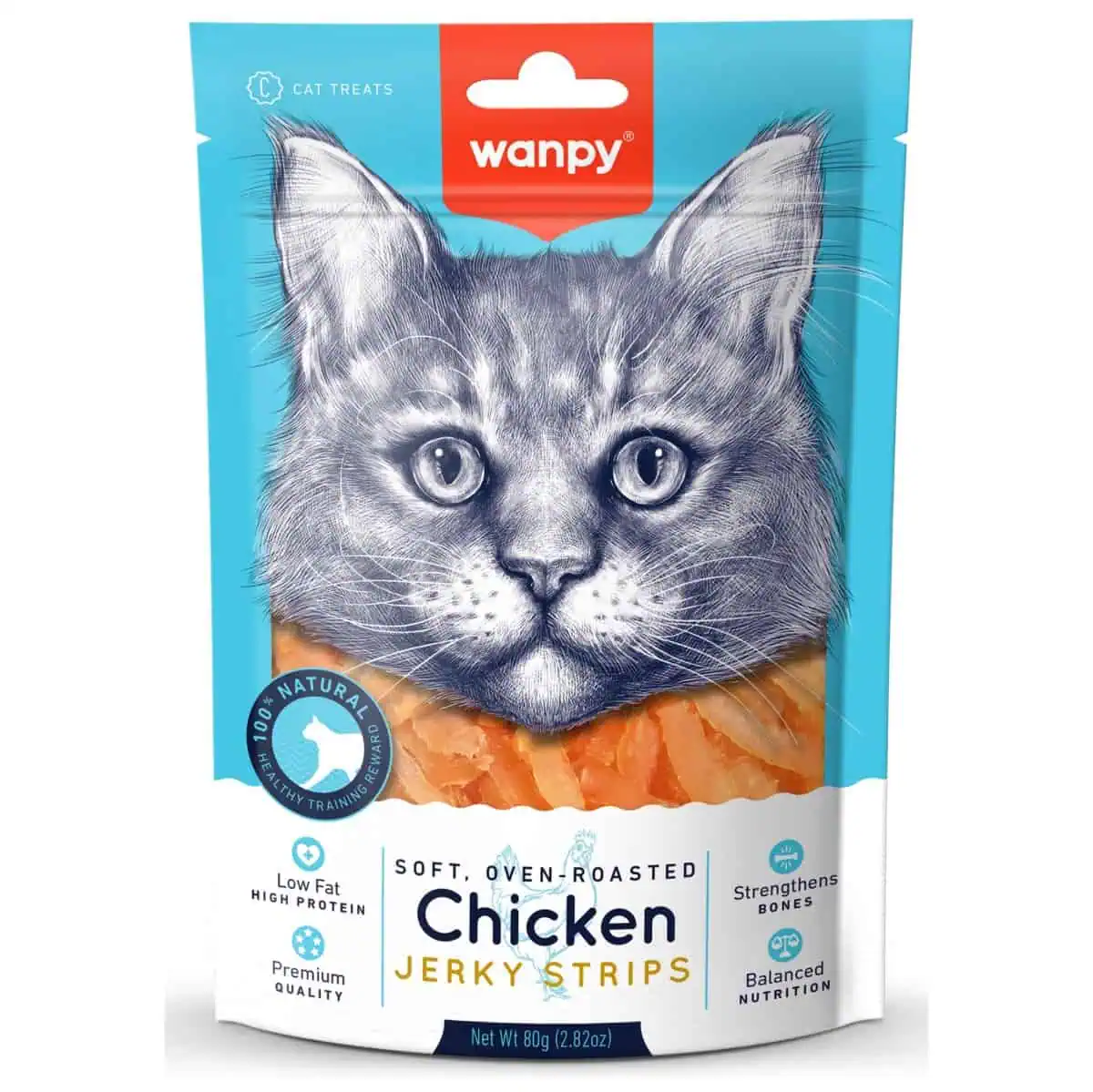 افرح قطتك مع شرائح دجاج جيركي ناعمة من وانبي - وجبات عالية البروتين ومنخفضة الدهون لأصدقائها القطط. مثالية للتدريب أو التمتع اليومي