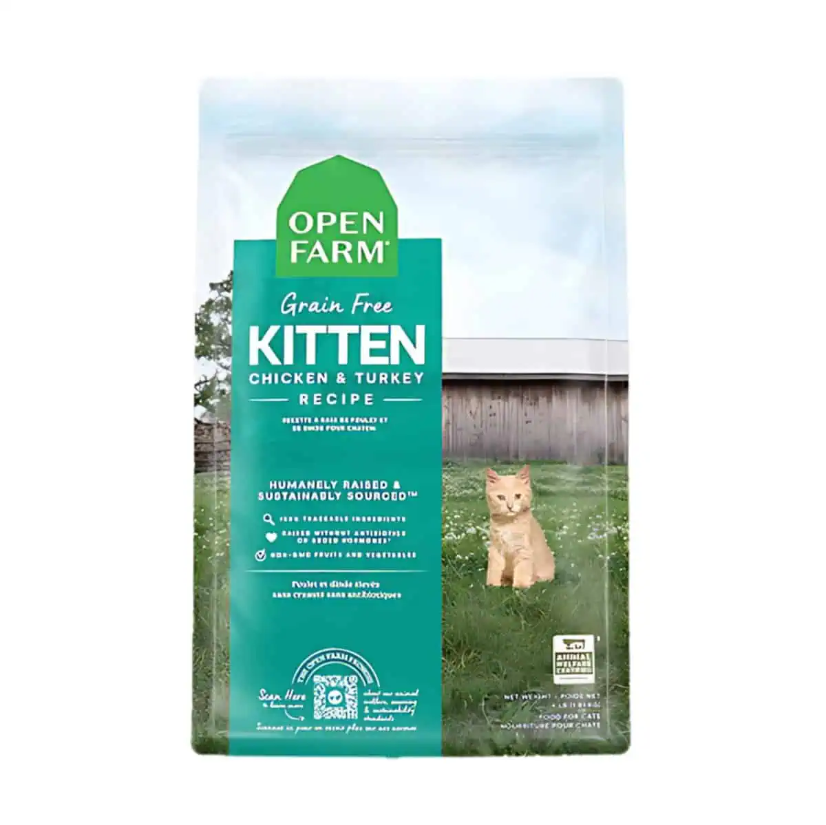 طعام جاف للقطط خالٍ من الحبوب مع دجاج وديك رومي مربيان بشكل إنساني، بروبيوتيك وفواكه وخضروات غير معدلة وراثيًا لنمو صحي.