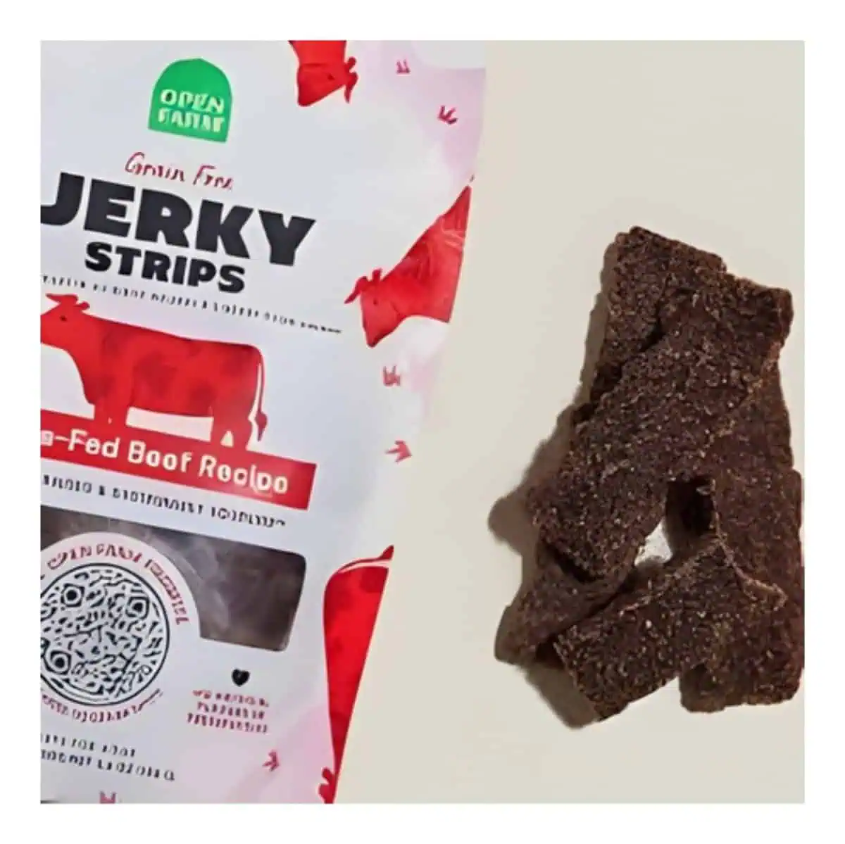 شرائح لحم الجيركي من اللحم البقري العشبي المفتوح فارم للكلاب، مصنوعة من مكونات إنسانية وقابلة للتتبع. لا إضافات صناعية، مكافآت طبيعية وصحية لحيوانك الأليف.