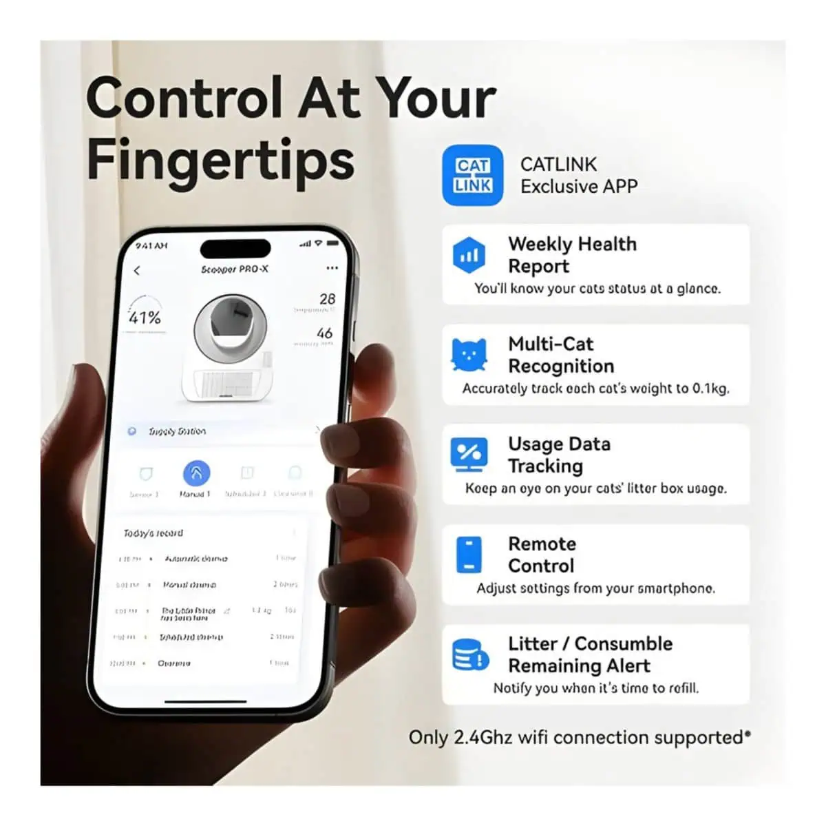 راقب وأدِر صندوق الرمل في أي وقت ومن أي مكان. تتبع الاستخدام، ابدأ دورات التنظيف، واضبط الإعدادات مباشرة من هاتفك.