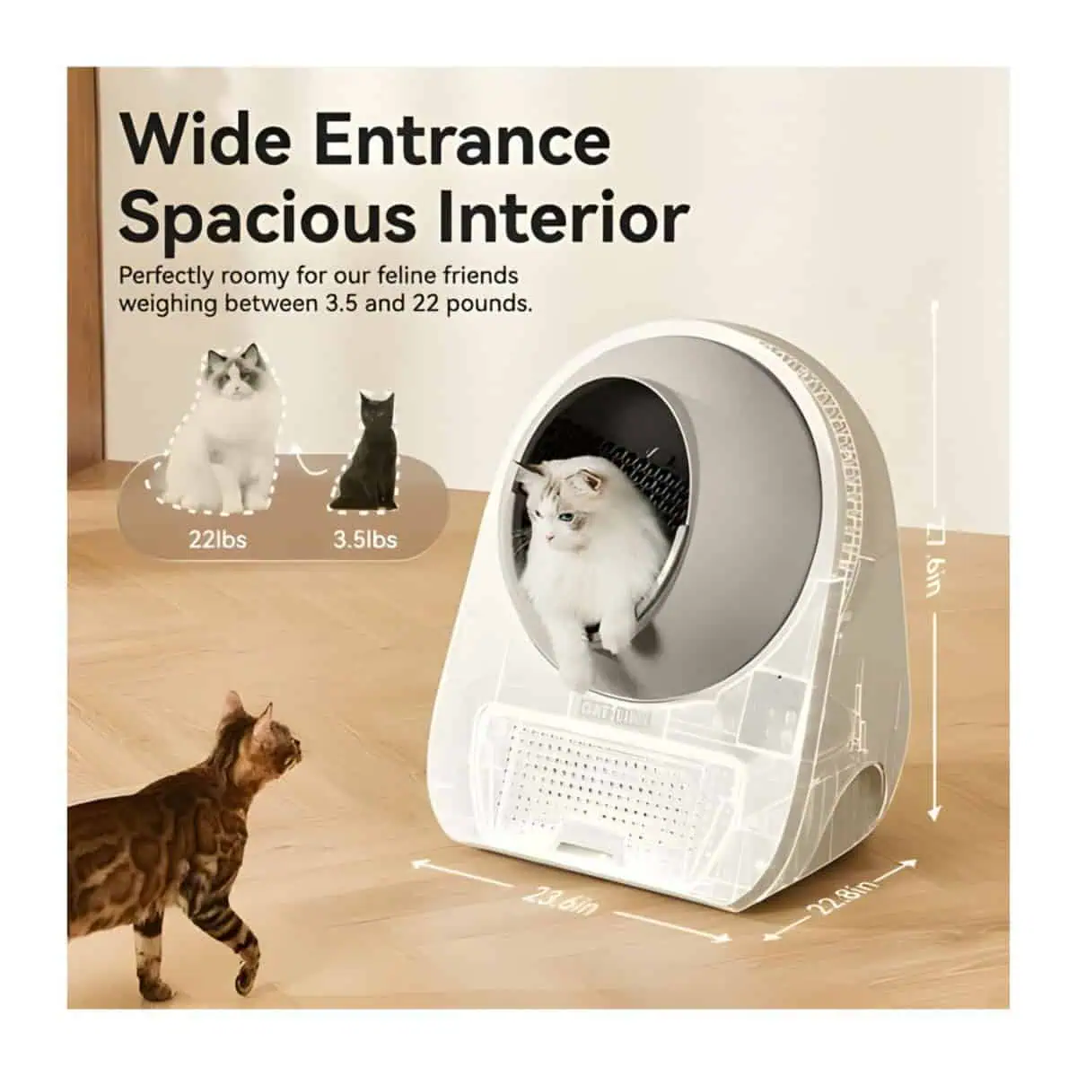 واسع بما يكفي للقطط التي تزن بين 1.5–10 كجم (3.3–22 رطل) لاستخدامه براحة.