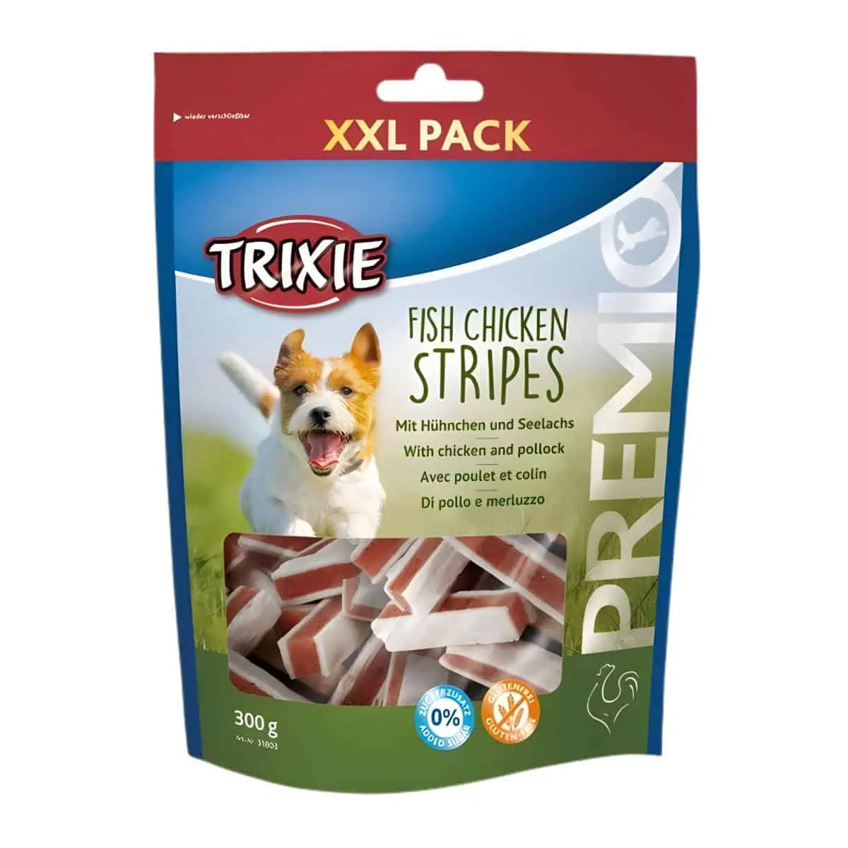 مكافأة تريكسى بريميوم شريط السمك والدجاج 300 جرام. نكهات لذيذة من الدجاج والسمك، 65٪ دجاج، مثالية للتدريب والمكافآت.