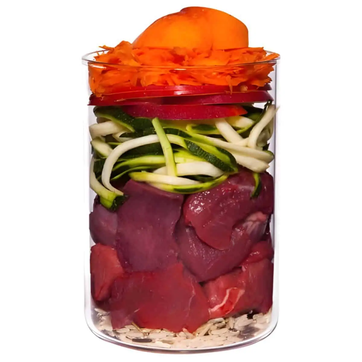 تعتمد هذه التركيبة على نسبة عالية من اللحم مع مزيج من لحم البقر الطازج، الأحشاء المغذية، والخضروات والفواكه الصحية. تم اختيار كل مكون لتوفير الفيتامينات والمعادن والعناصر الضرورية.