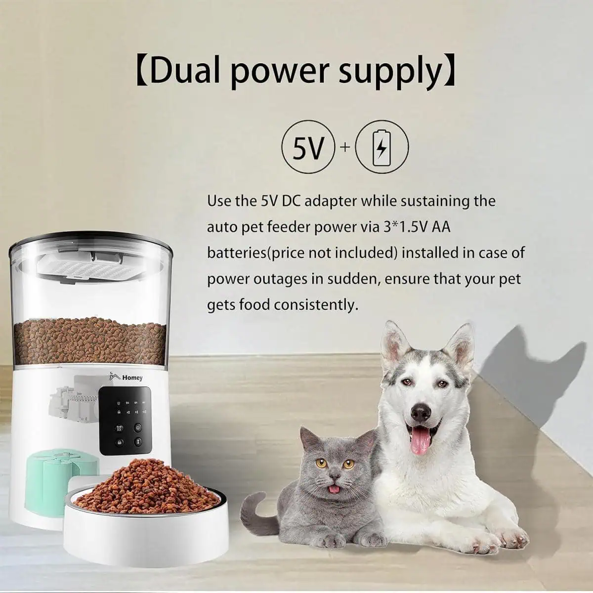- مصدر طاقة مزدوج: يعمل من خلال محول طاقة (5V DC) مع ميزة النسخ الاحتياطي بالبطاريات (3 بطاريات AA) لضمان استمرار توزيع الطعام حتى عند انقطاع الكهرباء المفاجئ.