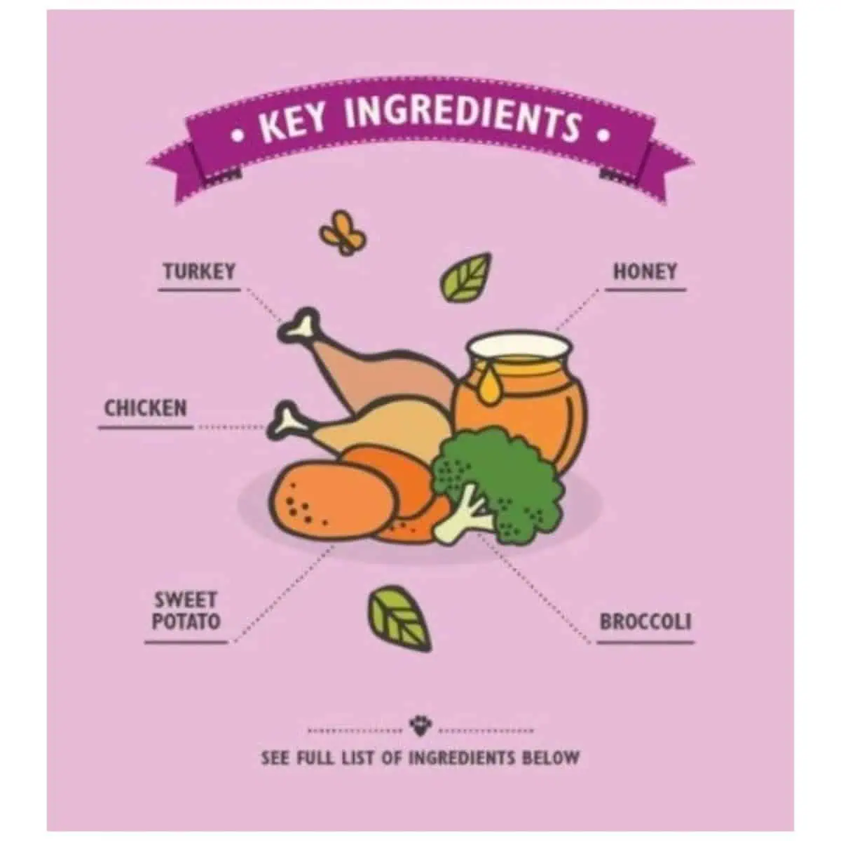 - مكونات طبيعية: مصنوعة من الديك الرومي، العسل، البطاطس الحلوة، والبروكلي.