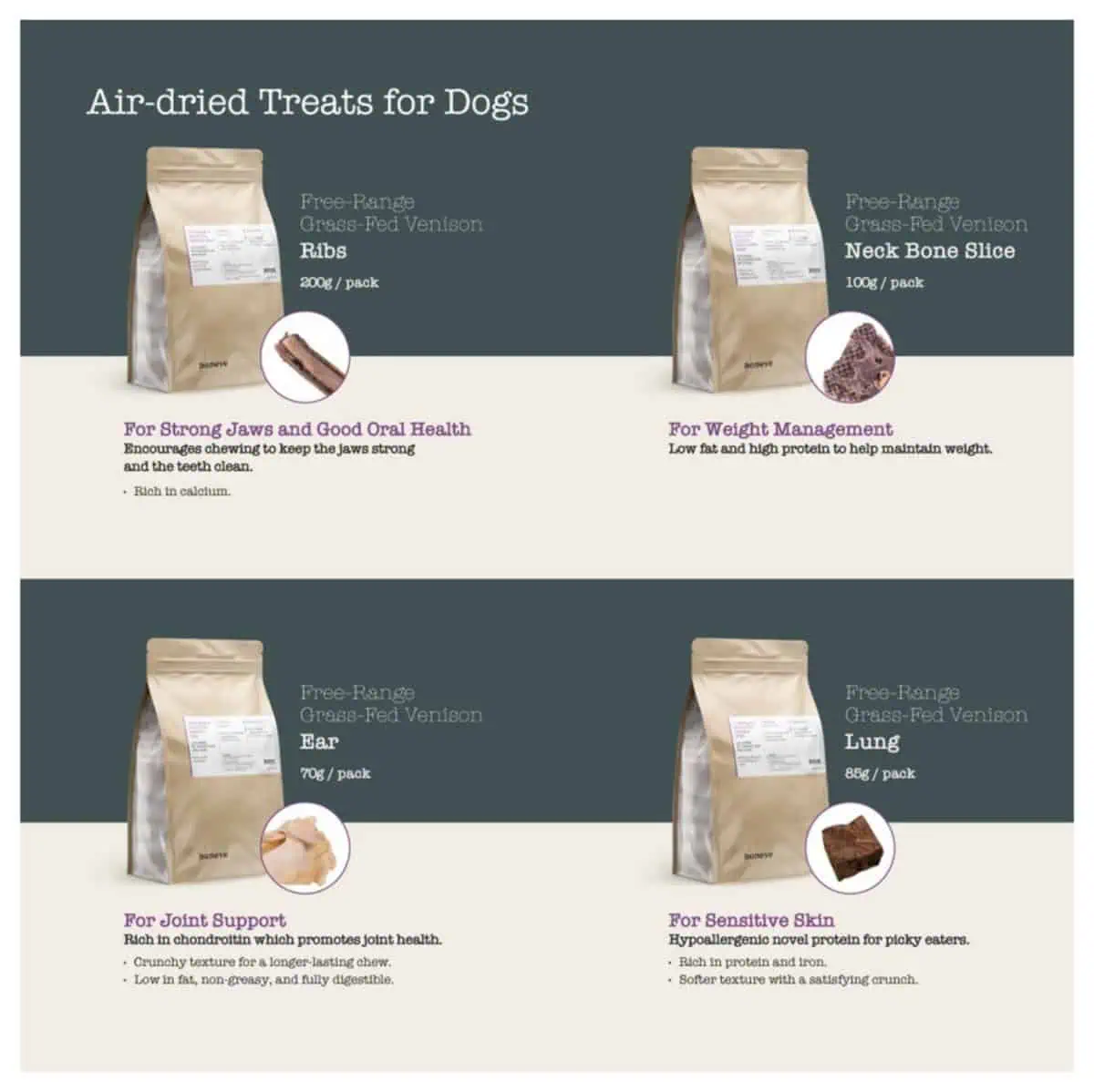 - مكوّن واحد عالي الجودة: أذن غزال نقية بدون حشوات أو إضافات أو مواد حافظة.