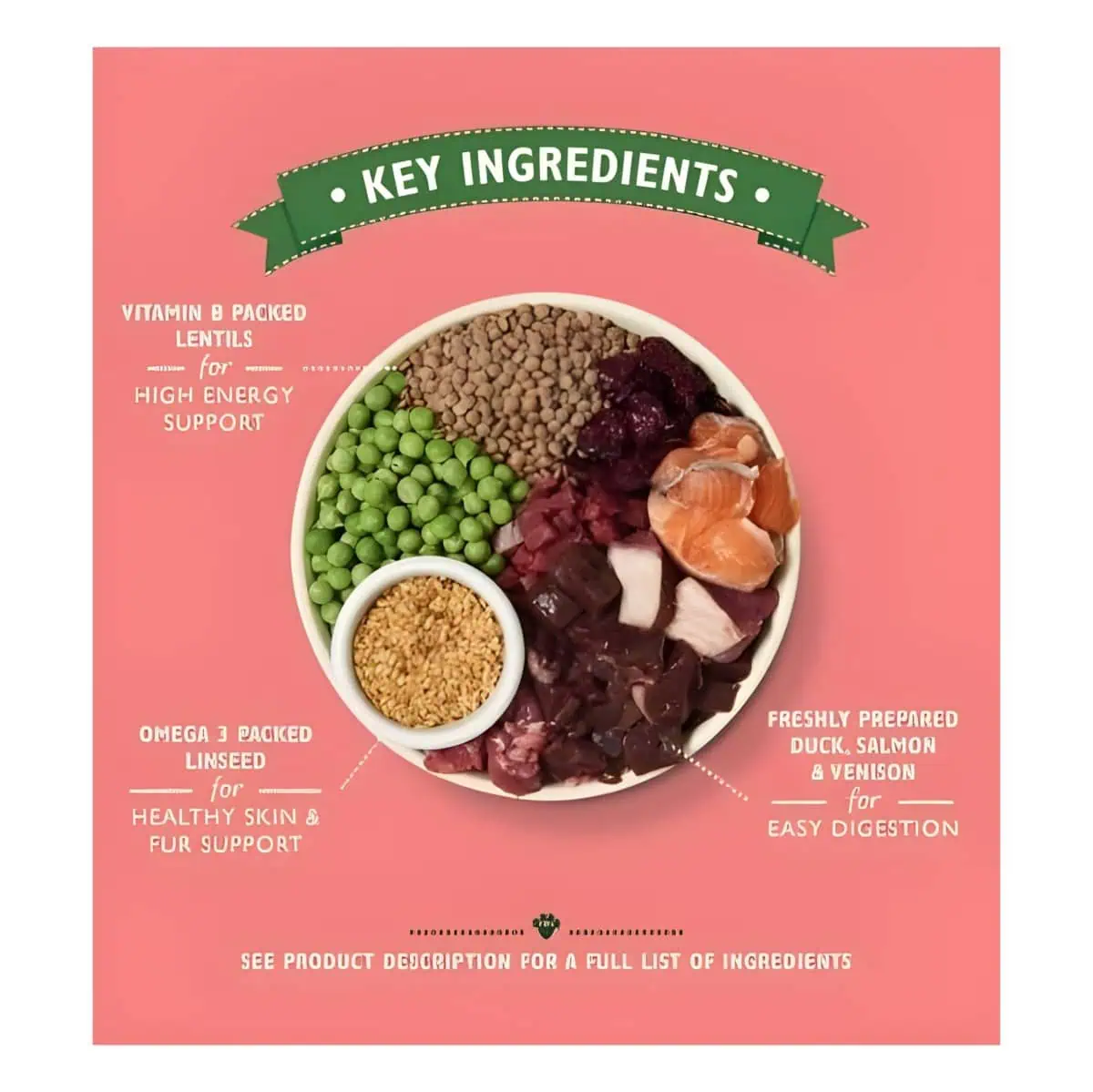 السمات الرئيسية البروتين العالي، غني بالأوميغا-3، يدعم المفاصل والجلد وصحة المعاطف