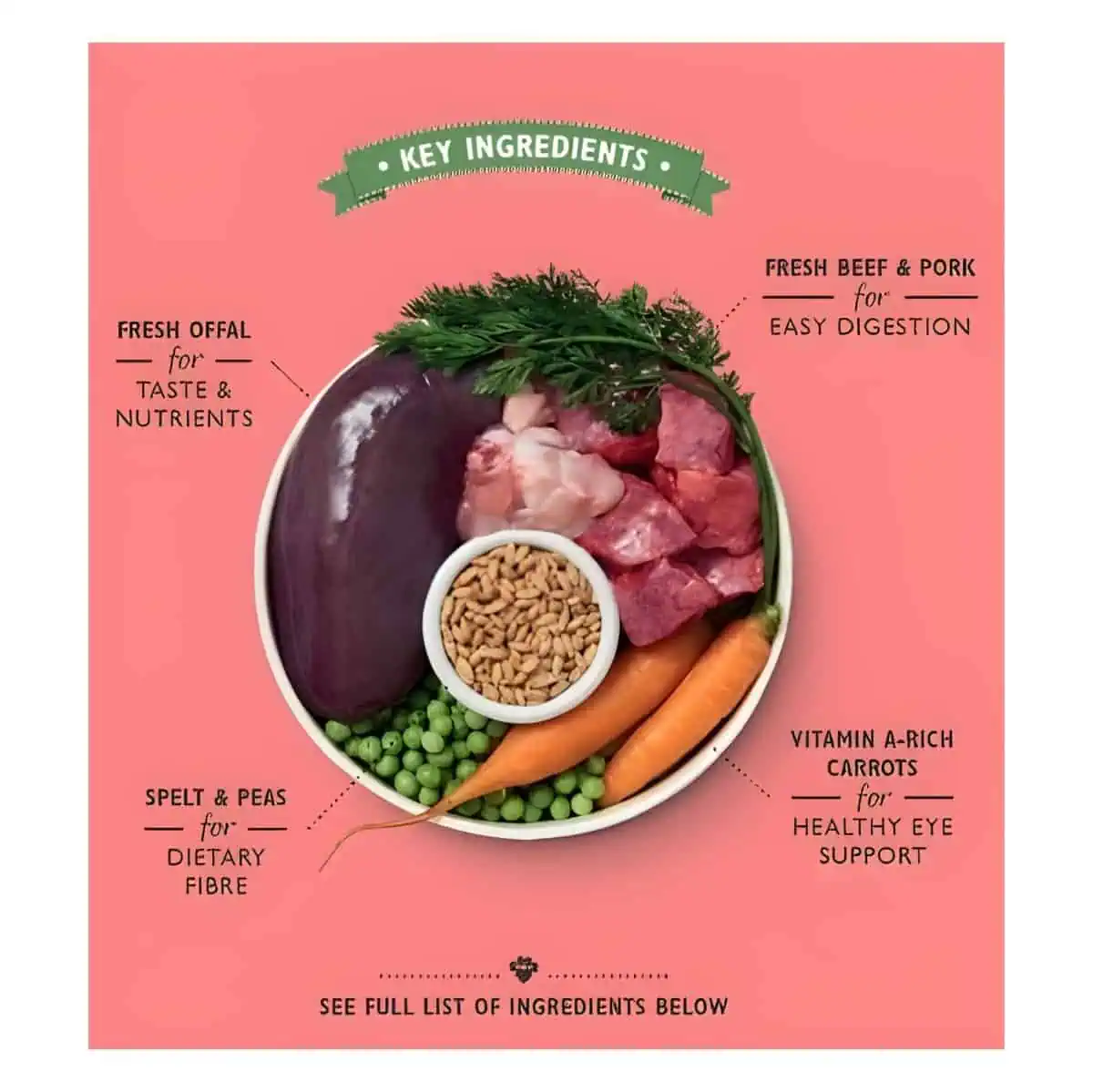 لحم بقر (36%)، دجاج (14%)، خنزير (4%)، خضروات عضوية 5% (جزر وبازلاء)، حنطة عضوية، فيتامينات ومعادن مخلبية
