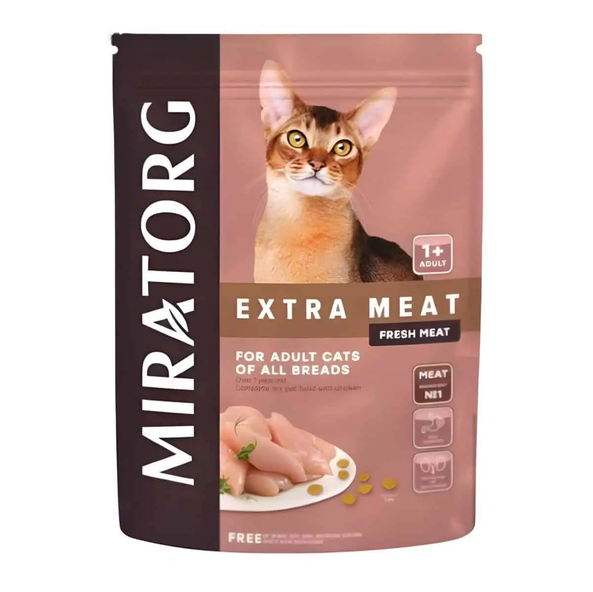 طعام ميراتورغ الجاف للقطط إكسترا ميت – صيغة الدجاج للقطط البالغة، تغذية كاملة، هضم سهل، ودعم صحة الجهاز البولي لجميع السلالات.