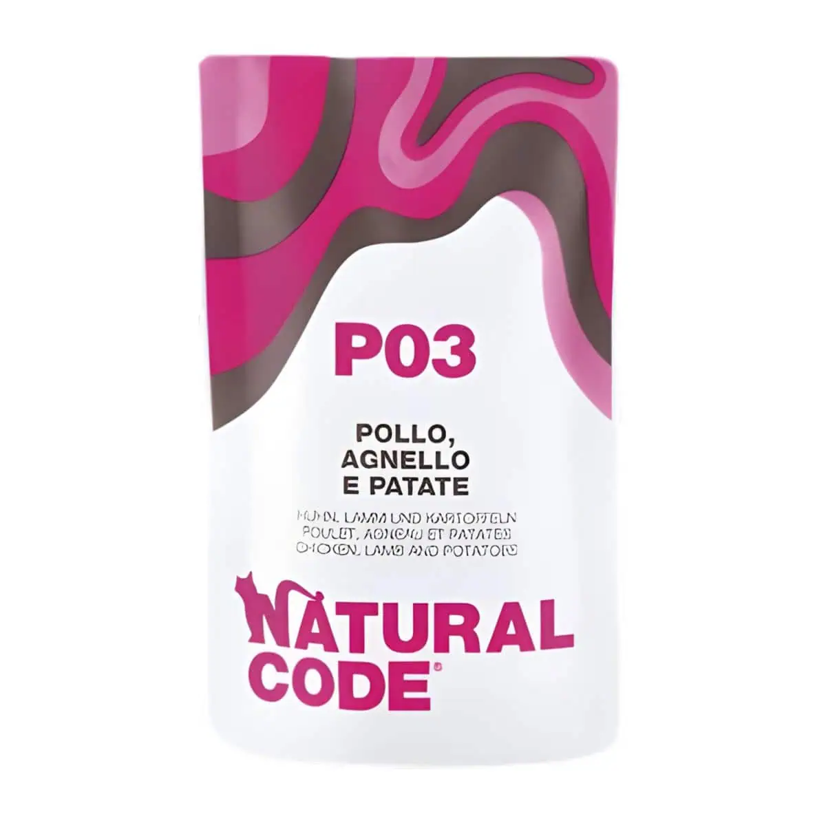 ناتشورال كود بالدجاج والضأن والبطاطس يقدم طعام قطط رطب غني بالبروتين في جيلي ناعم لدعم العضلات والطاقة والهضم الصحي.