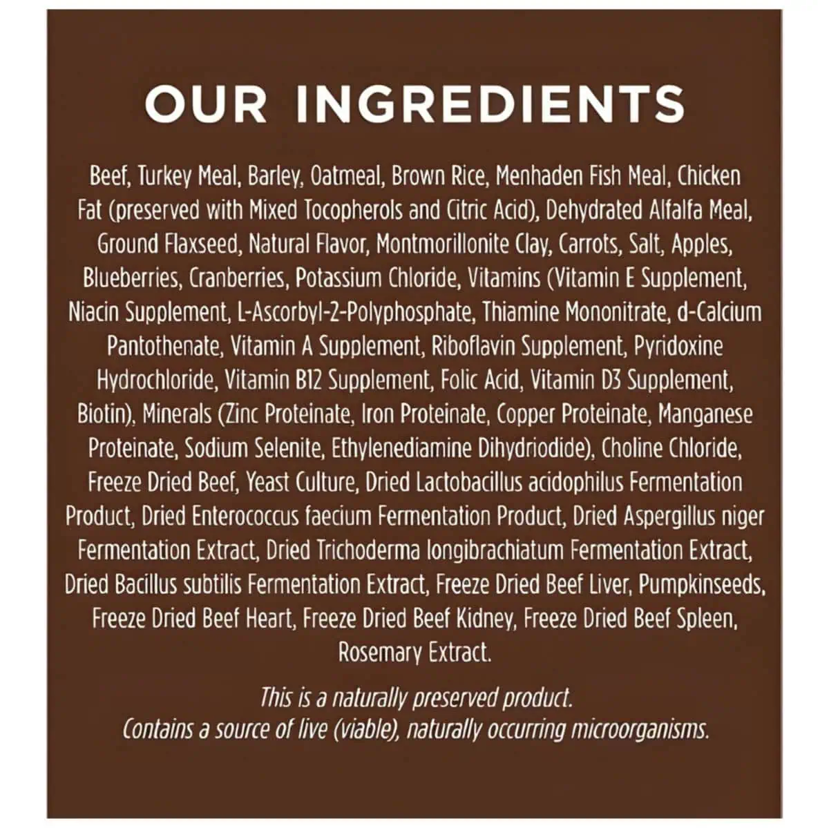Beef, barley, freeze-dried raw beef, whole grains, vitamins, minerals, and natural flavorings to support overall health and vitality in adult dogs.