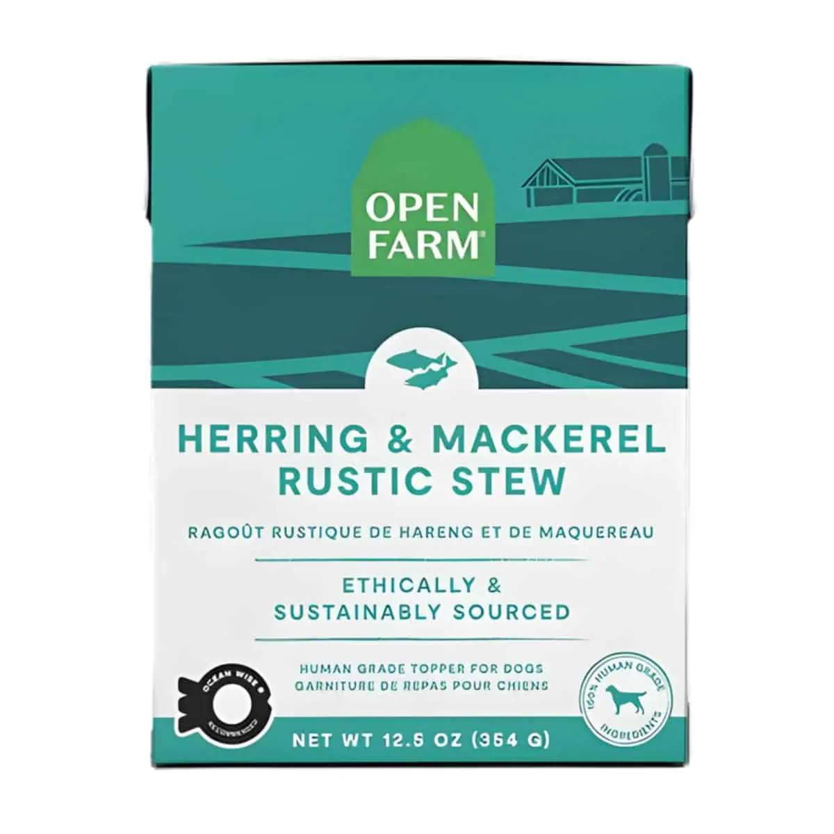 Open Farm Herring & Mackerel Rustic Stew Wet Dog Food: protein-packed, Ocean Wise® approved fish, non-GMO veggies, and 100% human-grade ingredients.