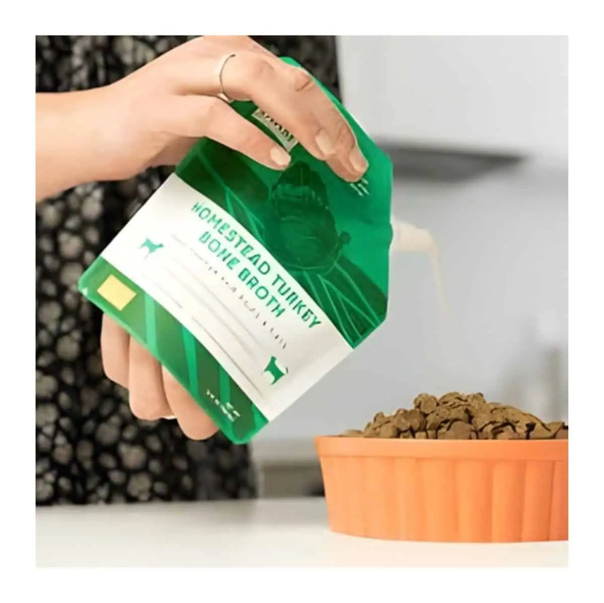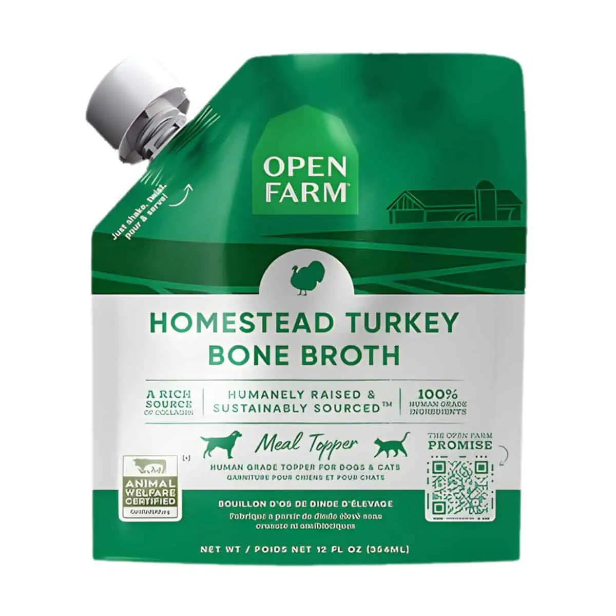 Open Farm Homestead Turkey Bone Broth is a nutritious, collagen-rich meal topper made with humanely raised turkey and non-GMO ingredients for dogs and cats.