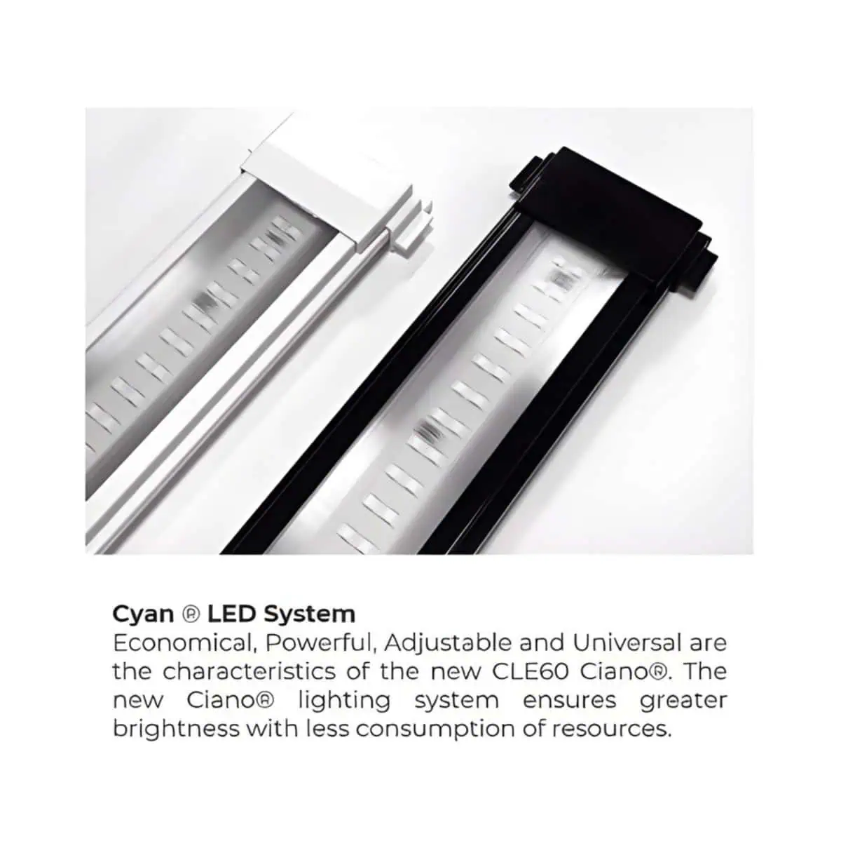 The aquarium includes the advanced CLE120 Ciano® LED lighting system, offering excellent brightness with minimal energy consumption. This lighting enhances fish colors, supports plant growth, and creates a stunning aquatic atmosphere.