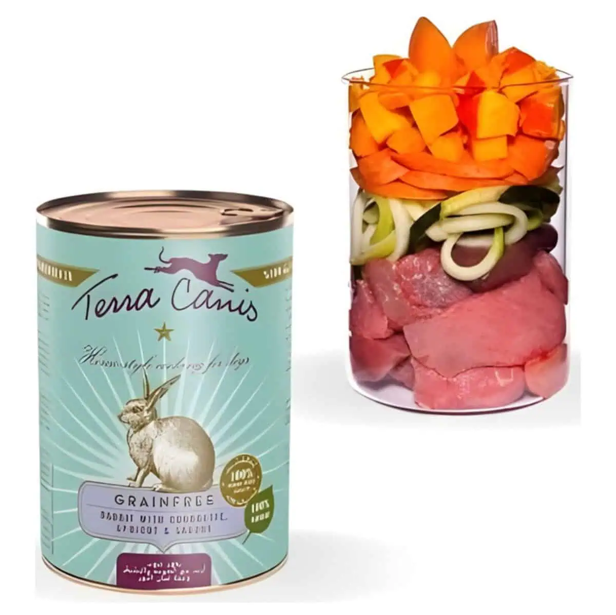 Rabbit meat (44%), turkey liver (15%), carrot, pumpkin, courgette (7%), apricot (4%), coconut flour, linseed oil, pumpkin seed flour, brewer’s yeast*, oyster shell*, basil*, savory* (0.2%), rose hip*, fennel seed*, ground linseed*, mineral clay, Andean salt*, seaweed*, minerals (*dried).