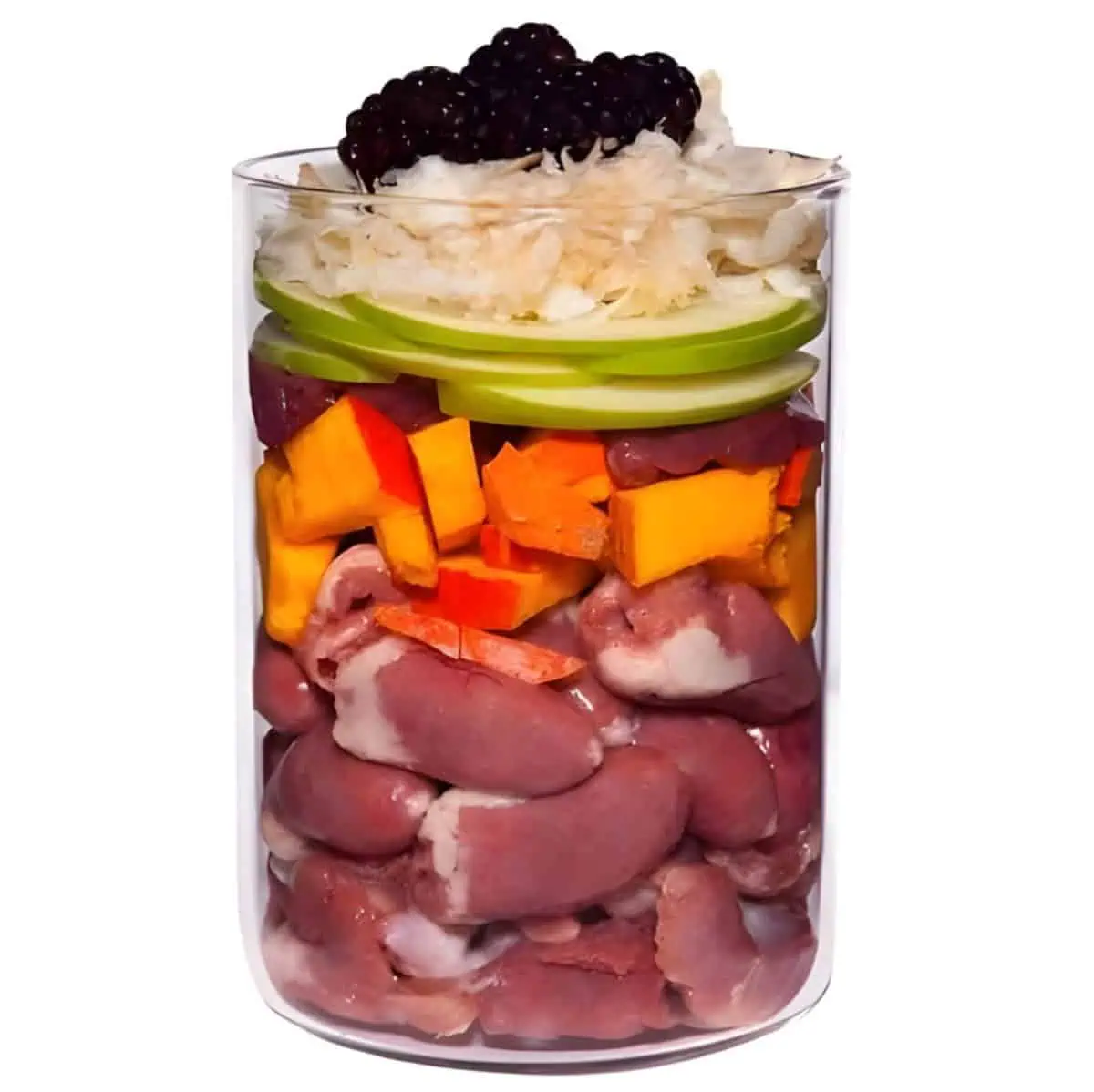 This recipe features chicken heart (28%), chicken stomach (22%), pumpkin, chicken liver (8%), apple, parsnip* (6%), chicken muscle meat (5%), blackberry (3%), coconut flour, linseed oil, pumpkin seed flour, oyster shell*, brewer’s yeast*, psyllium husk*, camomile*, rose hip*, dandelion* (0.2%), mineral clay*, Andean salt, and seaweed*.