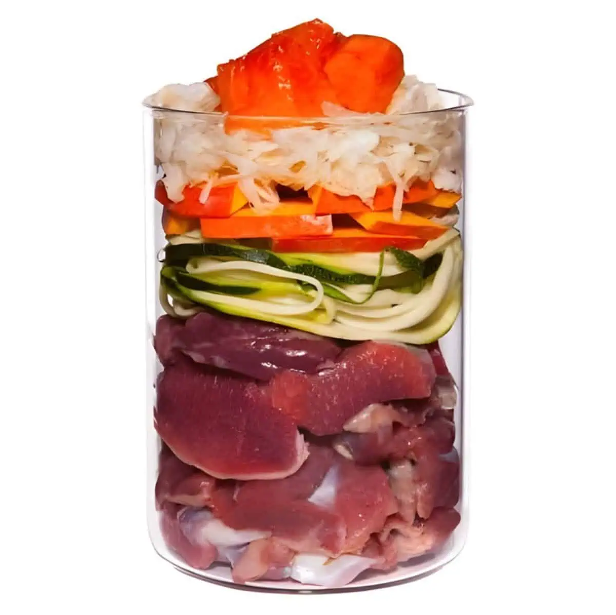 The recipe contains lean chicken meat and offal combined with a generous portion of low-calorie vegetables and fruits. This balance reduces energy intake while still supplying essential nutrients.