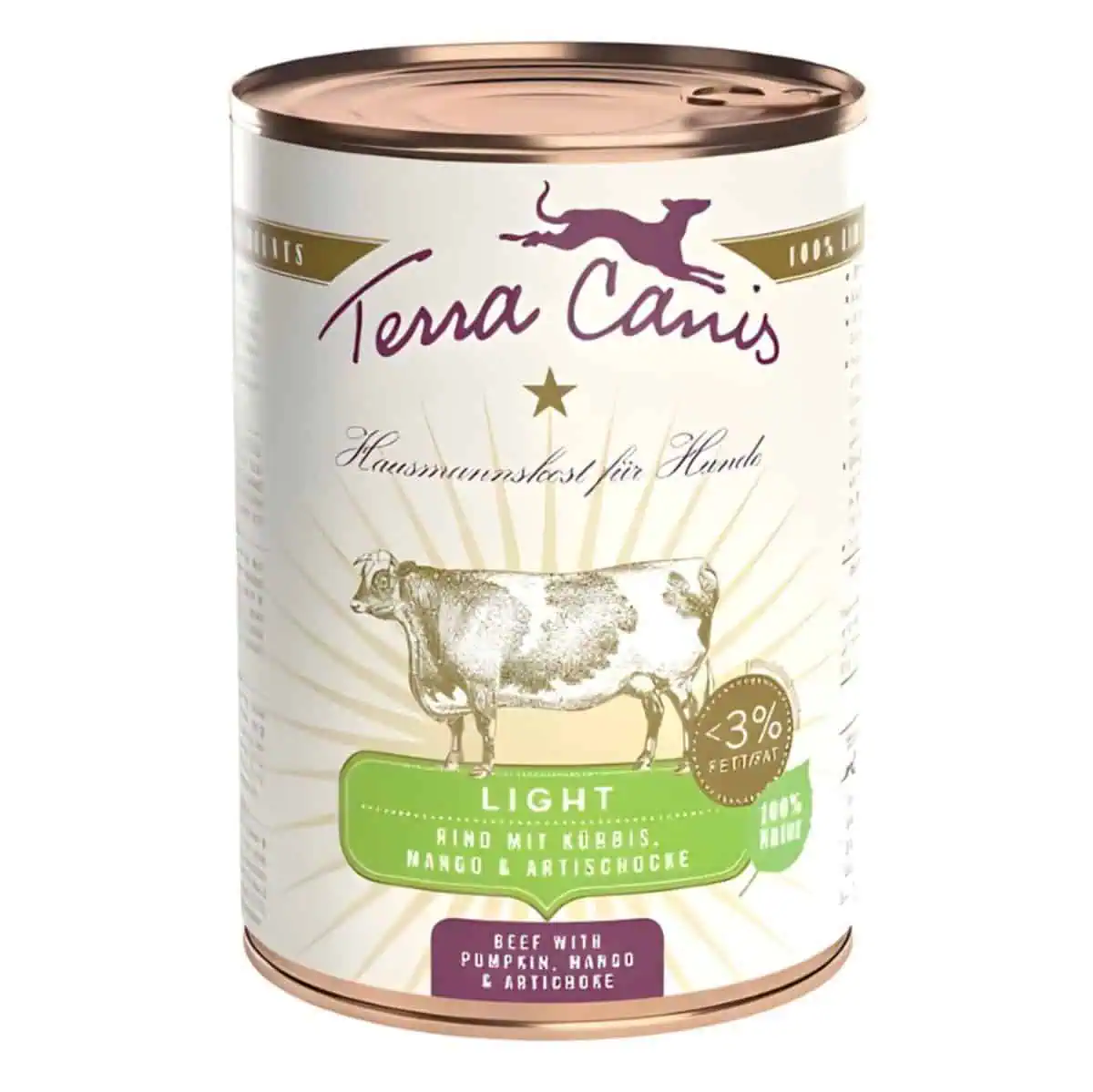 Terra Canis Light Beef Dog Wet Food 400g is a premium low-calorie wet food designed for adult dogs that are slightly overweight or prone to obesity. This recipe provides essential nutrients while helping your dog feel full without extra calories.