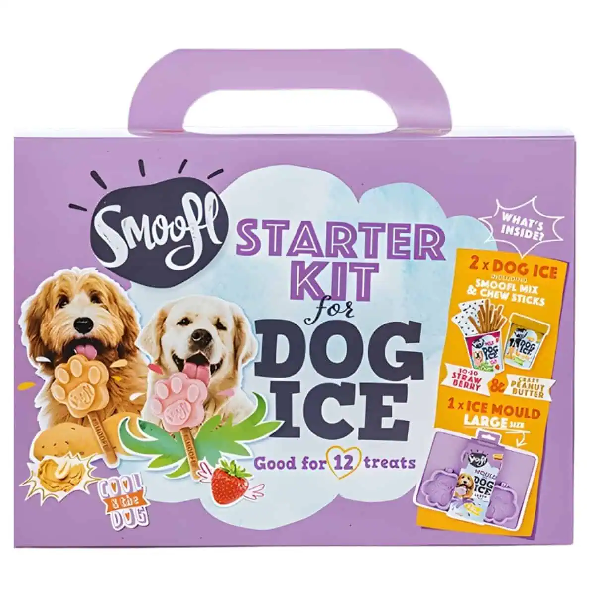 The Smoofl starter kit is an all-in-one solution for easy dog ice making. Inside the box, you’ll find two dog ice mixes, 20 edible chew sticks, and a Smoofl ice mould. Just mix, freeze, and enjoy stress-free treat time.