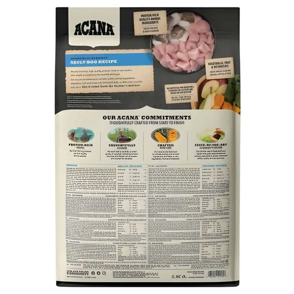 Acana Adult Dog Recipe offers your beloved medium-breed dog the perfect balance of nutrition and flavor. Crafted in Canada, this premium dog food is designed with carefully selected ingredients to meet the needs of adult dogs weighing 35-55 lbs. With a composition of 60% animal ingredients and 40% fruits and vegetables, it ensures your dog gets the optimal mix of protein and essential nutrients for a healthy and active lifestyle.