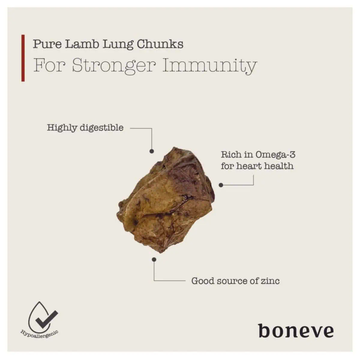 Boneve Lamb Lung Chunks are nutritious, natural, and healthy treats made from 100% free-range, grass-fed New Zealand lamb. Gently air-dried to retain maximum protein, omega-3, and essential nutrients, these treats are perfect for dogs of all breeds and life stages.