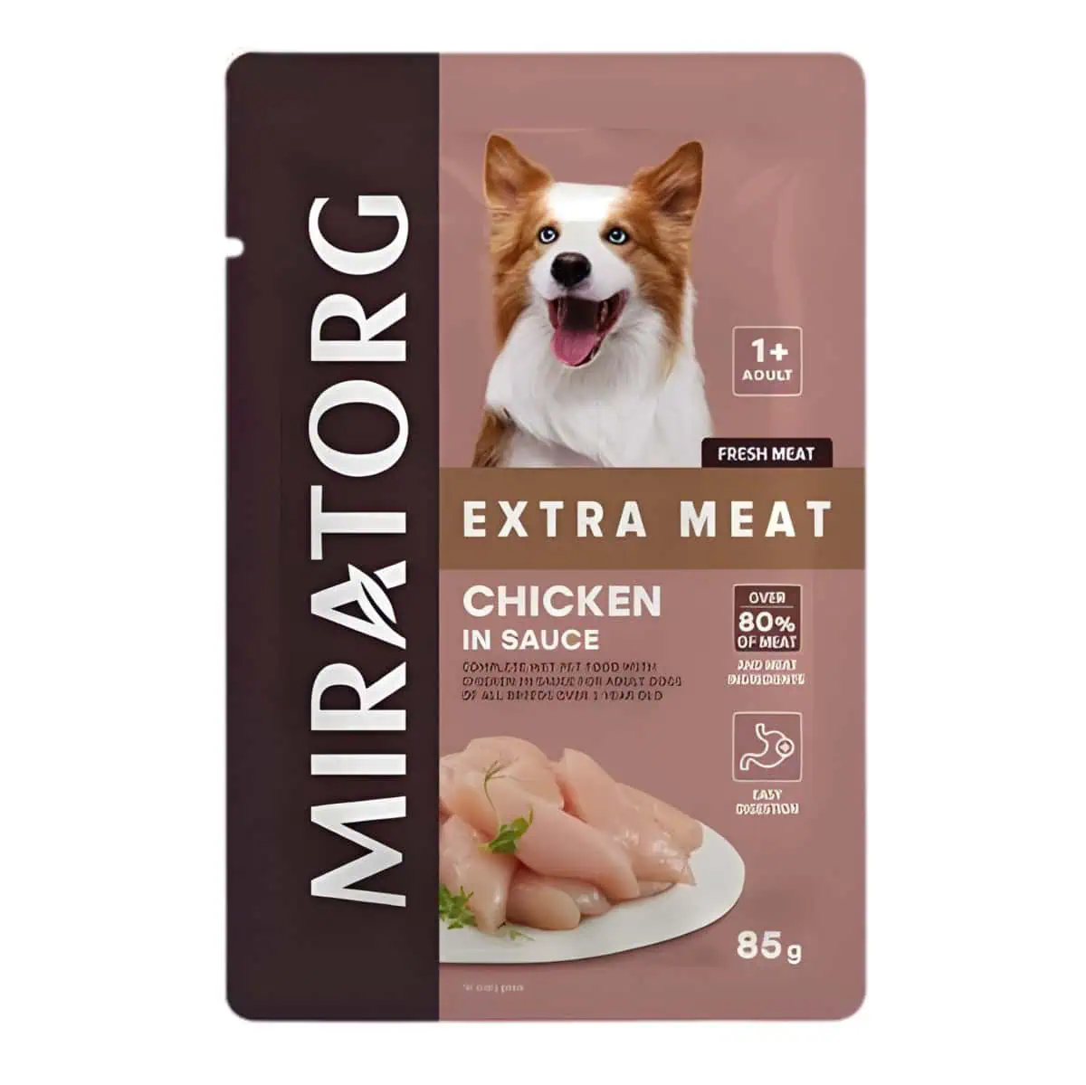 Give your beloved pet the meal they deserve with Miratorg EXTRA MEAT with Chicken in Sauce — a combination of natural flavor, superior quality, and balanced nutrition that every dog will love.