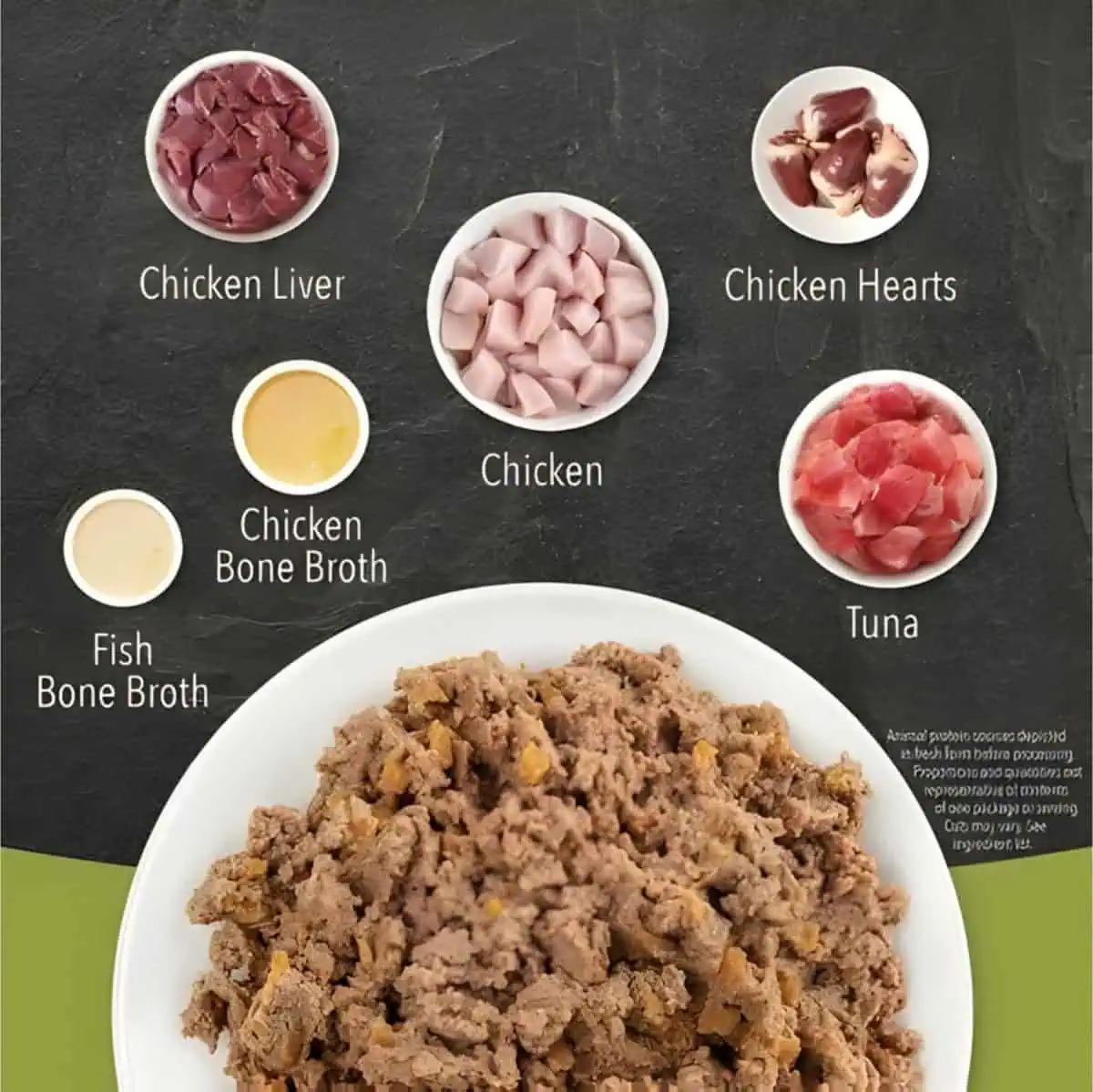Tuna (26%), Chicken (24%), Chicken Bone Broth (16%), Fish Bone Broth (16%), Dried Pumpkin, Salmon Oil (3%), Minerals.